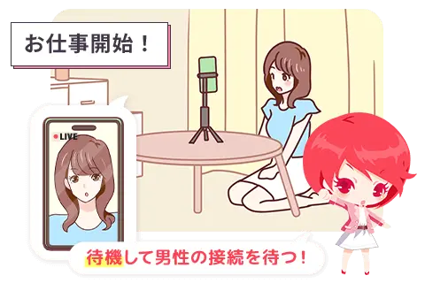 お仕事画面にあるチャットボタンをタップすると、チャット接続を待つ、待機という状態になります。ユーザーがあなたに接続すればチャット開始!接続時間1分ごとに報酬が発生します。